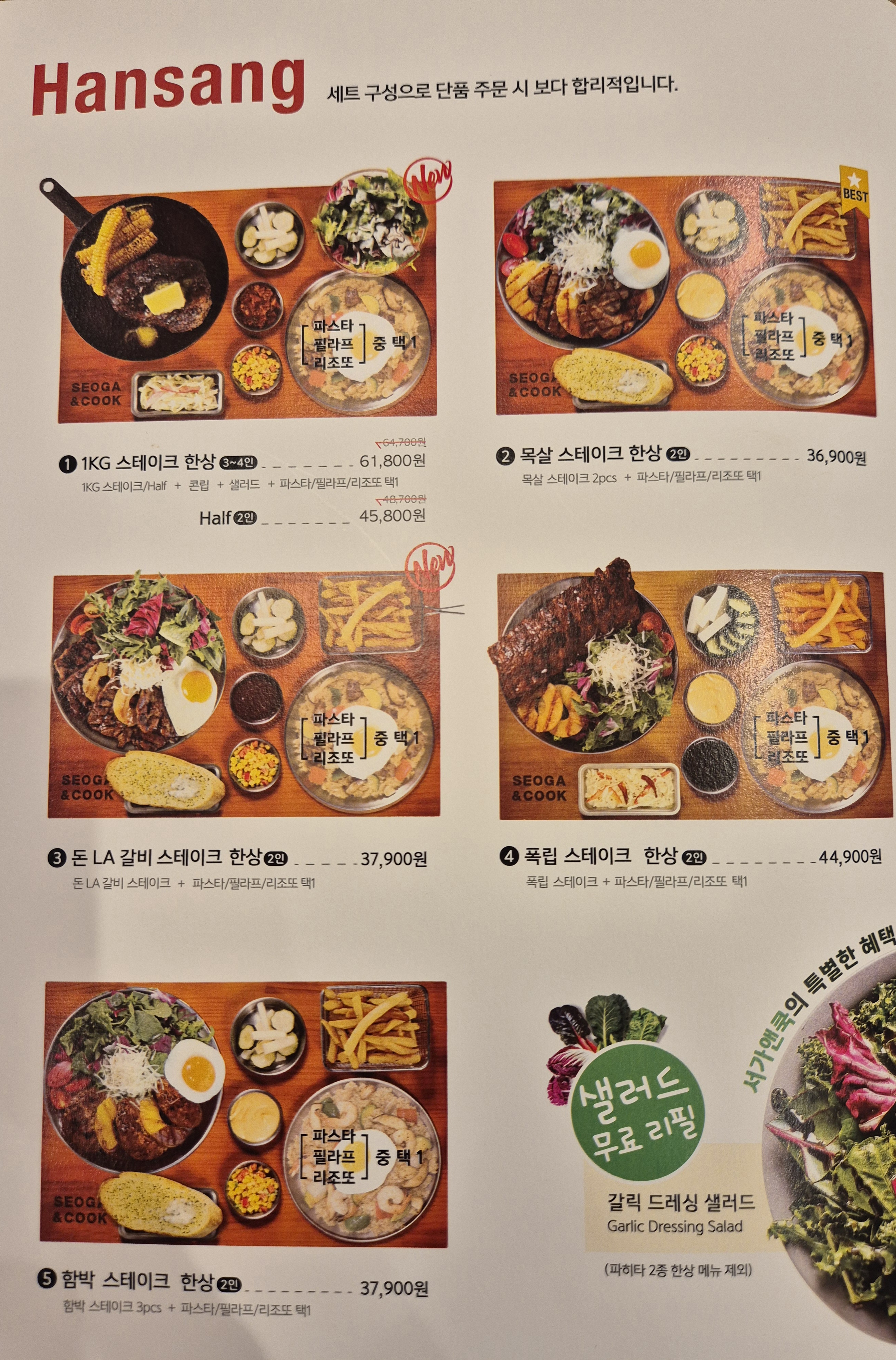 스테이크 + 파스타 / 필라프 / 리조또 중 택1 구성인데,